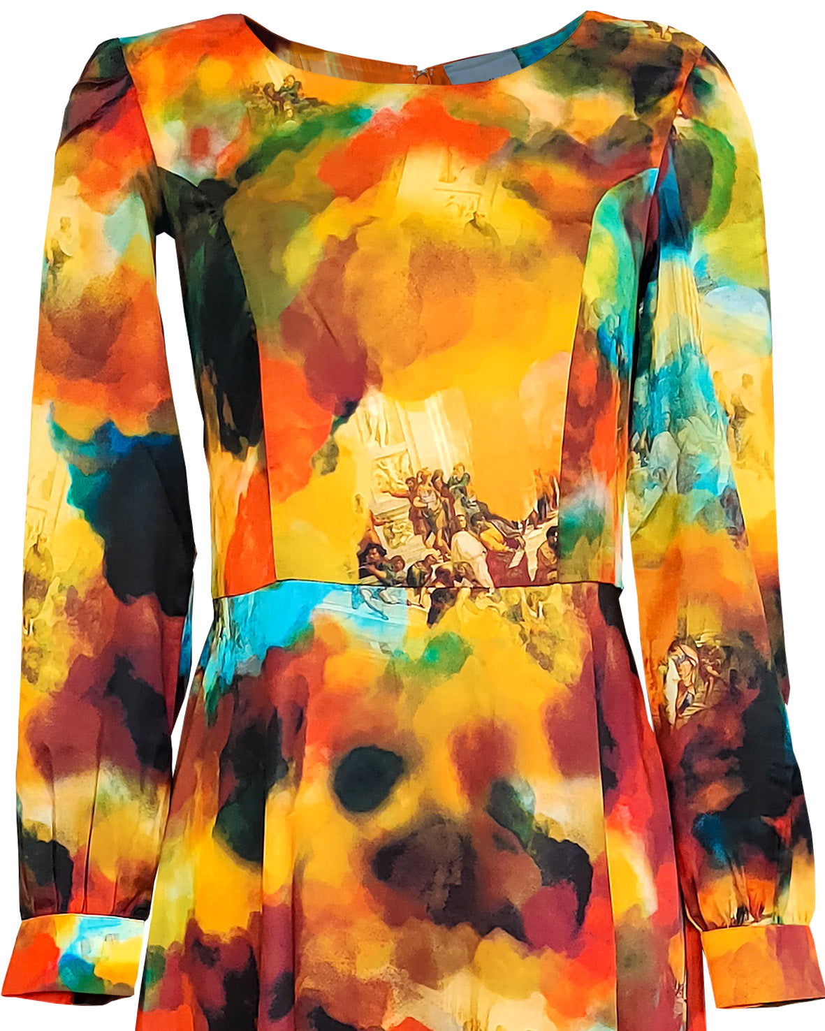 Long dress with round neckline and slightly puffed sleeves. "Retro" style model.